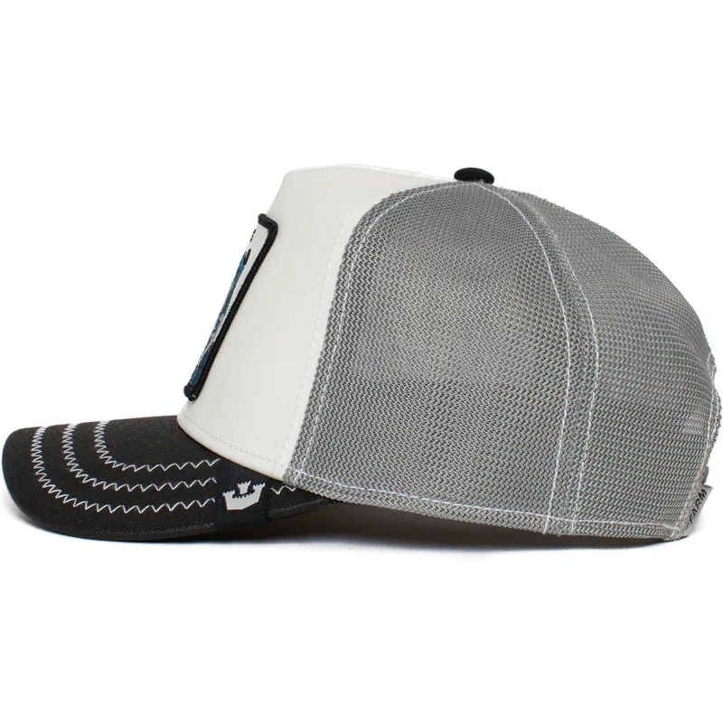 Die Kombination von Schwarz und Weiß ist in der Modewelt immer eine sichere Sache. In diesem Fall spielt die schwarz-weiße Tiger-Truckerkappe von Goorin Bros. King Sparkle The Farm mit diesen Kontrasten, um ein einzigartiges und auffälliges Stück zu schaffen. Der gestickte Tiger auf dem Frontpatch ist das Element, das den Hauch von Wahnsinn und Wagemut verleiht, den jede Mütze haben sollte.